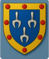 ''D’azur à trois fers à mégissier d’argent posés 2 et 1, à la bordure d’or chargée de huit besants de gueules.'' | ''D’azur à trois fers à mégissier d’argent posés 2 et 1, à la bordure d’or chargée de huit besants de gueules.'' | ||