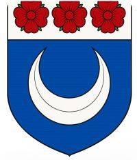 - « D’azur à un croissant d’argent, au chef du même chargé de trois roses de gueules. »