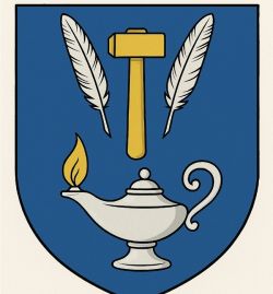 Proposition ALFI : *D’azur à un marteau d’or posé en pal, accompagné en chef de deux plumes d’argent et en pointe d’une lampe d'argent allumée d’or.*
