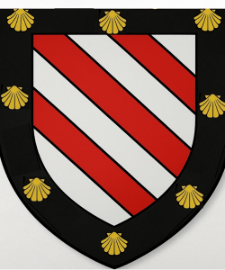 - De gueules à la bande d'or chargée de trois étoiles d'azur, accompagnée en chef d'une épée haute d'argent, et en pointe d'une crosse d'évêque d'or, le tout à la bordure échiquetée d'argent et de sable.*