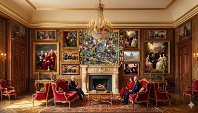 - À défaut de pièces d’époque, des œuvres contemporaines (impressions sur toile ou supports nobles) réalisées avec le concours de l’Intelligence Artificielle, visant à sublimer et réintégrer harmonieusement les photographies et portraits anciens dans leur contexte historique.