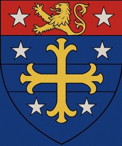 D’azur à la croix d’or cantonnée de quatre étoiles d’argent, au chef de gueules chargé d’un lion d’or.