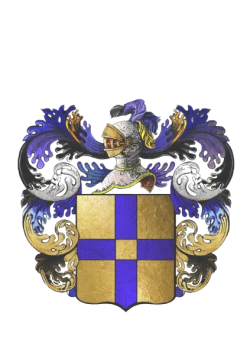 Analyse héraldique : Il s’agit d’un écu équipollé, formé d’un nombre impair de carreaux alternés, l’or occupant les cinq points dominants, l’azur les quatre points secondaires.