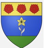 D’azur à une tige de lys d’argent fleurie d’or, terrassée de sinople, au chef d’or chargé de trois roses de gueules.
