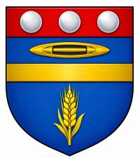 - D’azur à la fasce d’or accompagnée en chef d’une navette de tisserand du même, et en pointe d’un épi de blé aussi d’or ; au chef cousu de gueules chargé de trois besants d’argent.