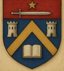 - D’azur, au chevron d’or accompagné en chef de deux tours d’argent et en pointe d’un livre ouvert du même ; au chef de gueules chargé d’une épée d’argent posée en fasce, surmontée d’une étoile d’or.