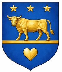 « D’azur à une trangle d’or soutenant un bœuf de même, accompagné en chef de trois étoiles et en pointe d’un cœur, le tout d’or. »