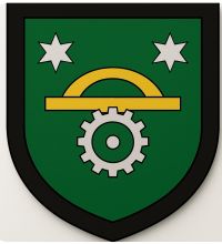 Blasonnement De sinople, à la roue dentée d'argent, surmontée d'un pont en arc d'or, et accostée de deux étoiles de six rais d'argent ; à la bordure de sable.