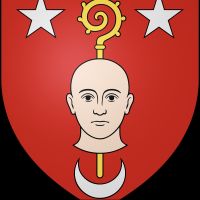 - Blasonnement : De gueules à une tête d’homme chauve posée de front, accompagnée en chef de deux étoiles d’argent et en pointe d’un croissant aussi d’argent, le tout brochant un bâton pastoral d’or.