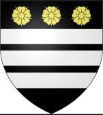 - De sable à trois fasces d’argent accompagnées de trois roses d’or rangées en chef.