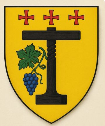 - Blasonnement :* **D'or à une masse de pressoir de sable, senestrée d'un cep de vigne au naturel fruité d'azur, le tout surmonté de trois croisettes de gueules rangées en chef.**