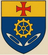 - D’azur à la roue dentée d’or accostée de deux navettes de tisserand d’argent, au chef d’or chargé d’une croix de gueules.