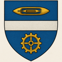 « D’azur à la fasce d’argent accompagnée en chef d’une navette de tisserand d’or et en pointe d’une roue dentée d’or. »