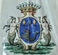 L'écu timbré d'une couronne de comte (...) et soutenu par deux sirène au naturel sur une terrasse ondée de sinople)
