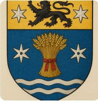 D’azur à la gerbe de blé d’or liée de gueules, accompagnée en chef de deux molettes d’argent et en pointe d’une rivière d’azur ondée d’argent ; au chef d’or chargé d’un lion de sable.