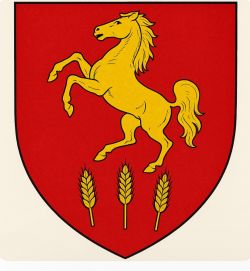 - De gueules au cheval cabré d'or, soutenu par trois épis de blé du même rangés en pointe.*