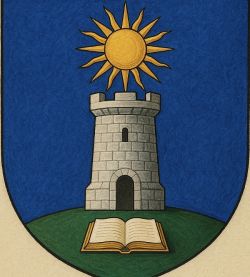 - Azure, a tower Argent masoned Sable, port and voids Sable, on a mount Vert; in chief a sun in splendour Or; in base upon the mount an open book Or, pages Argent.