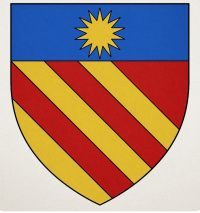 Blasonnement : D’azur, au soleil rayonnant d’or mouvant du chef ; au parti coupé d’or et de gueules, chargé de trois bandes de gueules posées sur l’or et de trois bandes d’or posées sur le gueules.
