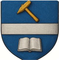 D’azur à la fasce d’argent accompagnée en chef d’un marteau de maçon d’or et en pointe d’un livre ouvert d’argent.