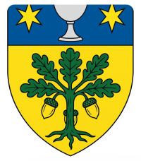 - D’or, au chêne arraché de sinople nourri de trois glands du même, au chef d’azur chargé d’un calice d’argent accosté de deux molettes d’or.