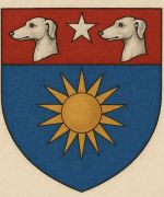 D'Azur au soleil d'or, au chef cousu de gueules, chargé de deux têtes de lévriers d'argent, naissantes et hissantes de la section, et surmontées d'une étoile du même à cinq raies.