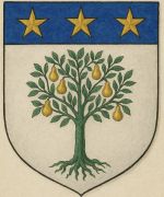 D’argent, à un poirier arraché de sinople fruité d’or, au chef d’azur chargé de trois étoiles du même.