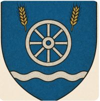 Blason ALFI provisoire : D’azur à la roue de moulin d’argent, accompagnée en chef de deux épis de blé d’or et en pointe d’une fasce ondée d’argent.