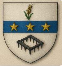 D’argent à une fasce d’azur chargée de trois étoiles d’or, accompagnée en chef d’un épi de blé de sinople, et en pointe d’une herse de sable.