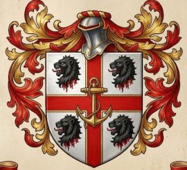 • Blasonnement : « D’argent à une croix de gueules chargée en cœur d’une ancre de marine d'or, cantonnée de quatre têtes de lion de sable arrachées. »