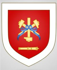 - Blason : De gueules, à trois marteaux d'or, emmanchés du même, liés d'azur, dont deux passés en sautoir et le troisième brochant en pal et renversé, au tube de canon d'or posé en fasce, rangé en pointe, à une bordure d'argent.