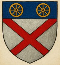 Armoiries : D’argent au sautoir de gueules, au chef d’azur chargé de deux roues d’or.